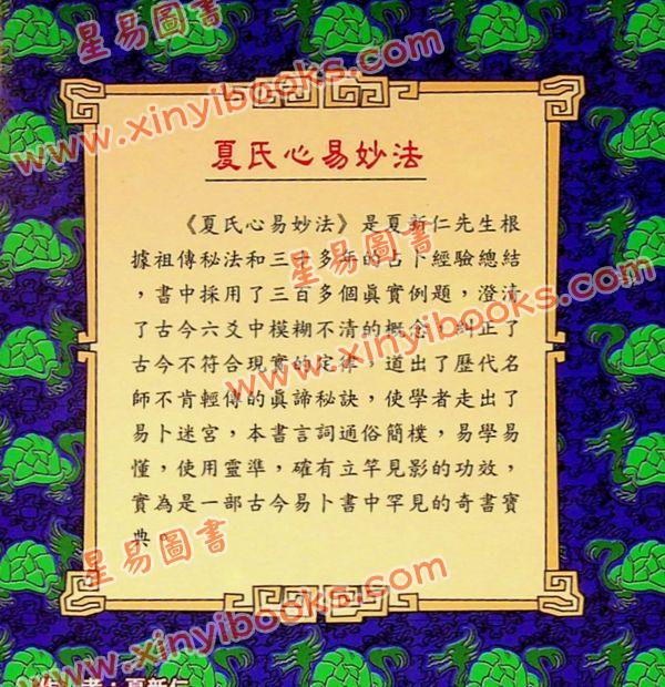 《夏氏心易妙法》是夏新仁先生根據祖傅秘法和本人三十多年的占卜經驗總結,書中採用了本人三百多個真實例題,澄清了古今六爻中模糊不清的概念,糾正了古今不符合現實的定律,道出了歷代名師不肯輕傳的真諦秘訣,使學者走出了易卜迷宮,本書言詞通俗簡樸,易學易懂,使用靈準,確有立竿見影的功效,實為是一部古今易卜書中罕見的奇書寶典。