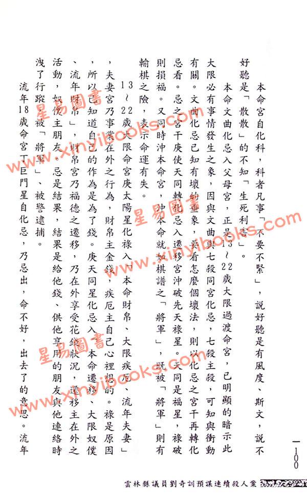 本書記載近年來社會耳熟能詳的二十五件重大刑案,重點不在刑案本身的案情,而是在於筆者如何實際運用斗數命盤,飛星四化,解析案情,演繹嫌犯與被害人的命理結構,提供真正喜好與真正懂得四化飛星演繹的同道,作為研究的參考。