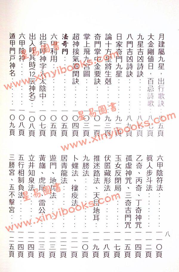 天罡布斗法。黃石公奇門神符經。奇門地盤圖。諸葛武侯金函玉鏡。九星神名、吉凶所宜。九星落局法。陰陽順逆八門起例。掌訣、八門吉凶歌。吉門會吉星斷。八門所宜、起青龍訣。起天乙貴人、起截路空亡訣。起喜神訣、五不遇時。五行生剋例。超神接氣、地支配八宮圖。八門排山掌、九龍飛山掌。諸葛武侯(金函玉鏡)一二O圖局。裴晉公(金鎖玉環)遁甲出行要訣。九天玄女紀事。奇門遁甲的源流。奇門遁甲參考書目。