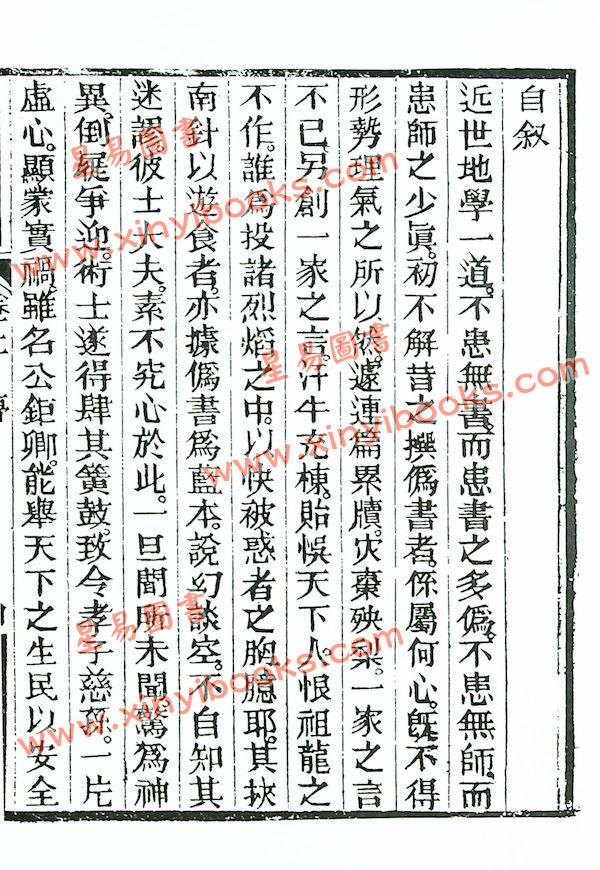 近世地學一道,不患無書,而患書之多偽,不患無師,而患師之少真,初不解昔之撰偽書者,係屬何心,既不得形勢理氣之所以然,遽連篇累牘,察棗殃梨,一家之言不已,另創一家之言,汗牛充棟,貽誤天下人,恨祖龍之不作,誰為投諸烈焰之中,以快被惑者之胸臆耶,其挾南針以遊食者,亦據偽書為藍本,說幻談空,不自知其迷謬,彼士大夫,素不究心於此,一旦聞所未聞,驚為神異,倒屣爭迎。術士遂得肆其簧鼓,致令孝子慈孫,一片虛心顯蒙實禍,雖名公鉅卿,能舉天下之生民以安全於任席,曾不能逃術士之蠱惑,以自救其敗亡,可憫可嘆,凡歷代名師,不難明目張膽,悉取其訣以示天下人。無如僉人苦多,正無苦少,特恐奸惡之人,識得仙機妄希非分,故有守口如瓶之戒,遂蹈因噎廢食之譏,然而秘之雖深,於各經傳註中,未嘗不直言其訣,但必待家世仁德之英賢,口授心傳,以紹千秋之道脈,何嘗以吝嗇為懷,作鄙夫壟斷之計哉,所患者,有愷切濟世之心,著書立說,徒與偽術混淆誰分瑕瑜,則余之嘵嘵伸辯者,亦未免多事也矣。