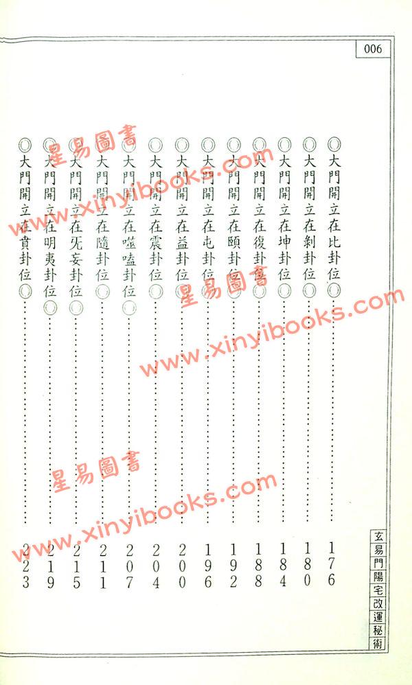 書中強調開大門的重要性,古語有云:千斤大門、四兩屋。正說明一間住屋,其開門定位立向的重要性;而本書所介紹的開門法是屬於小角度較為高深的開門之法。