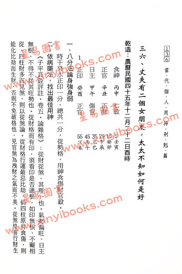 本書首一重點在於標明用神的探討,個人篇著重在八分法、病藥法之運用,以八分法來分辨身強身弱,有其公式可循,對初學者有莫大助益。針對婚姻刑剋部份,資料比前書更多,讀者可從六神個性的角度認識婚姻刑剋其實和個性有很大的關聯。最後女命章,分為離婚或婚姻美滿二種,美滿者藏有玄機,不像書中所言如此好。