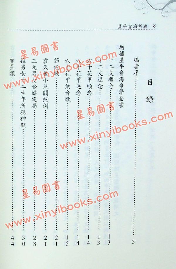 星者七政四餘之星學也.平者徐子平之八字學也.霞陽水中龍即以此命名曰.星平會海全書.星學之道,古有道家張果老星宗.望斗仙經.元朝首相耶律楚材.著寺憲曆法天官經.星學大成等.其詞奧理深.苟非一般所能瞭解其義.況天道有變.七十年歲差.宿宮移位.會海之量天總尺.皆為舊尺.清乾隆四十六年,參照西洋曆法.修改用新尺.其吉凶飛宮皆依新尺.清時設欽天監天文臺.編著七政臺曆.是為官曆.為一般星學家之依據.一九三六年七政臺曆頒行中斷.且時移勢改.星學之道日漸式微.逐有宮主與度主之爭議.莫衷一是.蓋用宮主者簡.用度主者繁.致有紫微斗數之興起.因其簡而學也.古之論命以八字為體.以星盤為用.譬如八字是車.星盤是輪.八字走大運小運.星走大限小限.星既式微.今人只用八字.蓋八字是以六甲紀年月日時.一翻百年經.即可起排八字.然排定八字易.窮究八字之理難.如三命通會.洋洋灑灑數萬言.讀者不知籨何切入,窮通寶鑑.滴天髓命賦.近有徐樂吾先生之註解.堪為一時之選.而星平會海一書.自明清迄今.乏人註解銓釋.年欠代煙用詞雖雅.錯字甚多.時代不同.文詞稍有差異.若不加以修正銓釋.棄之坊間.乏人問津.其實會海子平部.資料甚豐.實為諸書所未及.筆者老矣.以垂暮之年.不忍中華國粹被煙沒.暇餘執筆成書.存其原文.加以訂正.並附古時星平論命之式.但願能俾益後學.則幸甚矣.