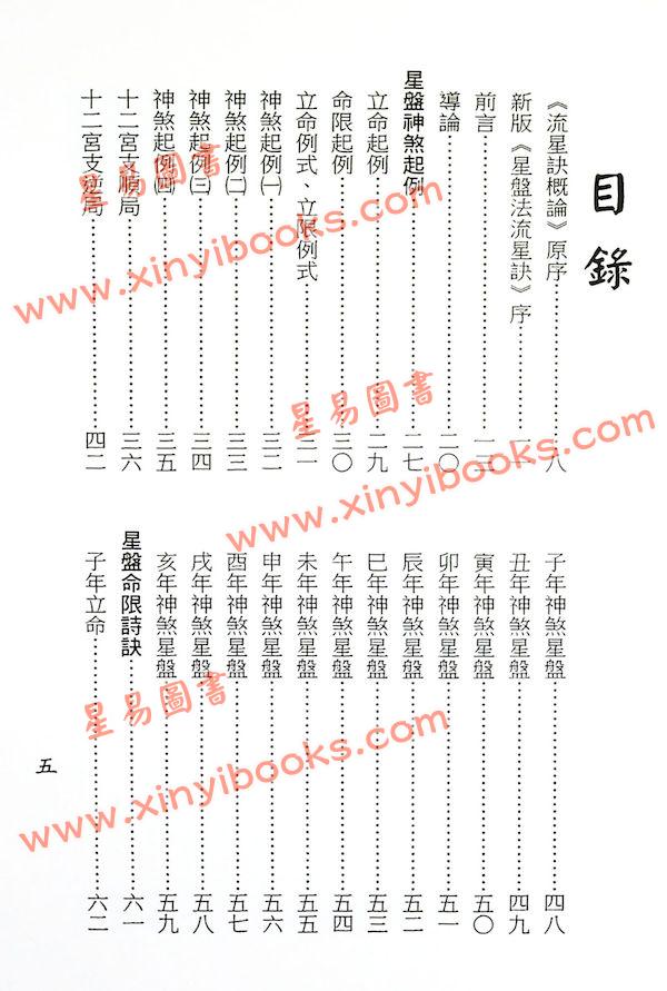 故此,在「再版」之時,將「子年」至「亥年」,十二組的「命盤」,合計一百四十四組的「神煞」,彼此間之「組合」吉凶詩賦,全部列列於「命、限」之前。讀者在推論「吉、凶」之時,自當有更為方便之取捨,改書名為「星盤法流星訣」。 按「星盤法」,在「命術」系統中,是屬於「古典式」的一種。坊間少有對此法作系統式之介紹,大抵都是以「祖傳」式的抄本,是屬於一種「家族式」世代相傳的方式在延續此法。因此,在「神煞」之取用才多少是有些「此家略有不同於別家」。譬如:有些是用「破碎、血刃」,有些又是取用「披麻、的煞」等之不同。故此,酌情取用普通大多數所採用的「神煞」為準。至於「十二立命」的吉凶詩詞,坊間尤為罕見難得。此次「再版」之時,作者一一予以補齊所缺的範圍。文中或仍有誤植之字,祈請讀者見諒。