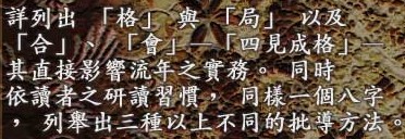 詳列出「格」與「局」以及「合」、「會」-「四見成格」-其直接影響流年之實務。同時依讀者之研讀習慣,同樣一個八字,列舉出三種以上不同的批導方法。