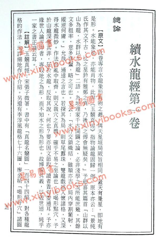 【原文】此卷專言水龍象形肖物之義,與天星垣局厥旨相同,蓋天 有是星,即地有是形,水能象星,亦能肖物,此與《玉髓真經》指物論 龍固歸一例,原本亦云:「景純氏作其文不古,比之星鈐有雅鄭之異, 乃後人之傅會無疑矣」。予最喜其篇首「山群以山為龍,水群以水為龍 」二語,為地理家千古開闢之論,必非淺學之流所能庶幾,其餘文多粗 率,意多穿鑿,略之可也,又云:「水行交鎖織結,雖順亦吉:局內穿 割箭射,縱逆何庸」。允哉,通達之言也,若探其為局,則草尾露珠, 雙龍戲感必懷諸格,又深得水龍微妙,作法而亂中取齊,則又裁穴之真 機,確乎不易之至論也,夫喝形點穴,予於山龍深辨其非,茲於水龍, 反取其說,何也?要亦因文節取,讀者貴有變通耳,予亦緣世人論平洋 者,專取地之為形,而不知水之形為形也,故博採其義,以破世迷,純 乎一家之書正論云耳。