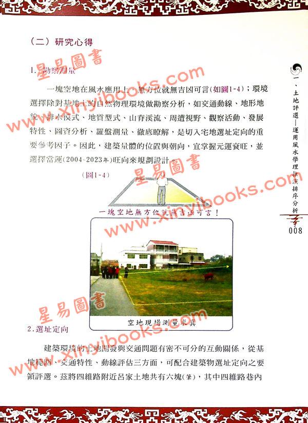 風水理論與哲學內涵,鮮為人知,常因鄉野傳奇,並夾著雜宗教背景與不合時宜的民俗觀點介入,穿鑿附會令人迷惘,造成褒貶毀譽互見。究其因,實為大眾的認知差異與溝通不良所致,又因理念不同,論述易流於斷章取義,要全面完整、公正、客觀作出合理的評價的確不易。風水典籍文獻,既多且雜,學理雖奧妙無窮,卻難以窺其堂奧,並缺乏適當客觀的實踐案例來援引。俗話說:「有如遊騎於沙漠,難尋歸宿,輕舟於大洋,難登彼岸。」有鑑於此,篩選累積多年之實踐個案撰寫本書,案例昭示了風水理論與易經思維、陰陽五行、八卦精義、圖資輔助、文獻回顧諸多領域之間的互補關係,展現了土地優選、選址定向、動線規劃、建築形制、景觀設計、營建管理、宅第優選、空間整合、調整佈局、論文研究等,以營建實踐、空間整合、期刊論文三章彙編分類計 21 例;參採學理引述與科技工具應用,操作上,現地勘察、度量、記錄,並運用衛星、GIS、地籍等數位圖資,藉由套繪現況圖說分析,用以求真,尤對風水術的應用方法和重要作用,可提供研究與參考。
