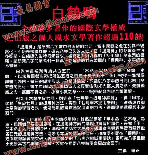 「捉用神」是研究八字當中最困難的地方當中深奧之處在於其千變萬化。即使是遍讀群書﹑研習八字已久的人士,在「捉用神」時都會產生很多疑問。白鶴鳴先生特眾要求,編寫這系列以專論「捉用神」為主題的書籍,給研究八字的讀者們一輯真正能幫助他們突破目前「捉用神」水平的參考書籍。