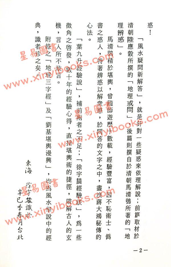 從客觀的立場出發,讀古書而窮其理,當可明書之真偽;真書者,明師之經驗積累,為理論與實踐之融合;偽書者,說幻言空,遇不懂而無話可說時,總以蘊秘藏訣,不敢洩露天機為藉口而故弄玄虛,誤人愚惑「風水疑問新解答」,就是針對一些疑惑來依理解說;前篇取材於清朝陸應穀所撰的「地理或問」,後篇則撰自於清朝馬清鴞所著的「地理辨惑」。
