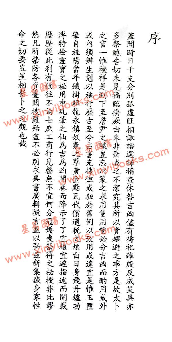 蓋聞時日干支,分別孤虛旺相諏咨選擇、稽查休咎吉凶,儘有禱祀雖殷,反成災異,亦多祭告醮切,未見福臨,揆厥甲來,非齋戒之不潔,究其所以,實趨避之乖方。是故,太卜之官,一惟機祥是測,下至詹尹之職,豈忘端策之求用,隻雙必分吉凶而酌用,或外或內須辨生剋以施行,歷古至今占書充棟,但或狃於舊例以致用。或違宜。是惟玉匣,肇自旌陽當年鐵樹驅龍,永鎮妖氛之孽,黃金點瓦代償逋稅之煩,白日身飛,丹爐功溥,特檢靈寶之秘用,申乩筆之仙為吉、為凶,開卷而降示了了,宜趨宜避指述,而開載歷歷,從此利有攸往,不論士庶工商,行見罄無不宜,何分冠婚喪祭,得之秘授非比謬悠。凡所禁防各資查閱,搜羅殆盡,不必別求異書,廣輯微言,益以弘茲新集。誠身家性命之切要,豈星相醫卜之乏觀也哉!