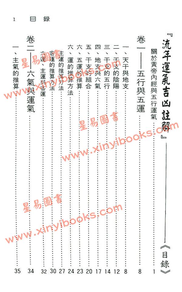 『流年運氣吉凶註解』,取材自黃帝內經的『五運六氣』篇,論述星體的詆動關係,以及所產生的運氣,對人生的吉凶影響。熟讀此書,不但可預知每一年、月、日、甚至每一時辰,大自然運氣的變化情況,以及所引起,以及所引起的吉凶反應。