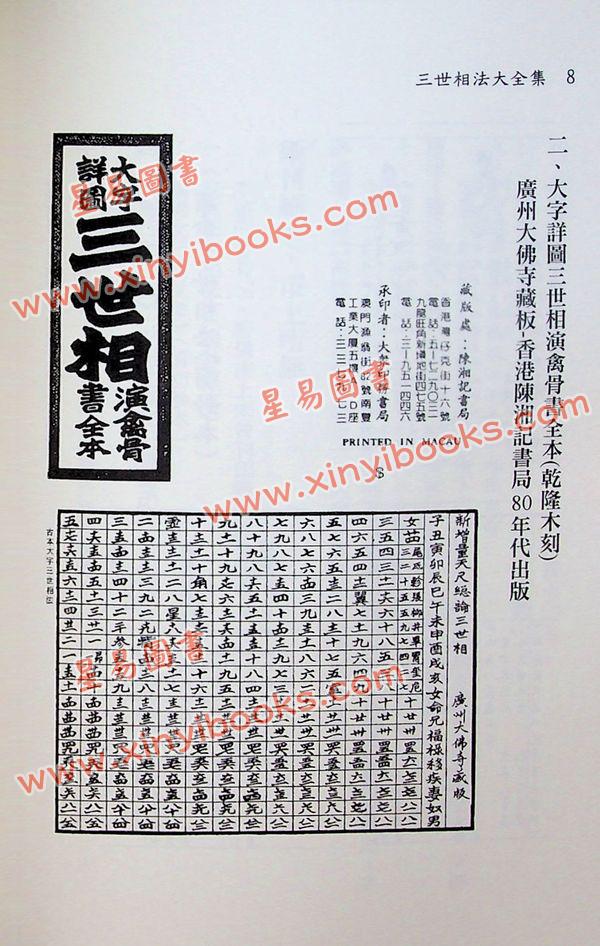 本書內容有三,皆係市上未曾刊印過的珍貴版本:《演禽三世相法》(明鈔原本)、《觀男女三世星命》(清初鈔本)、《演禽三世相法》,上海江東茂記書局印行,民國元年石印。