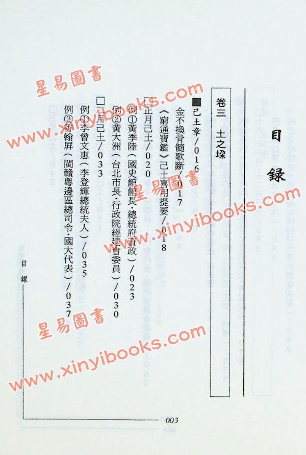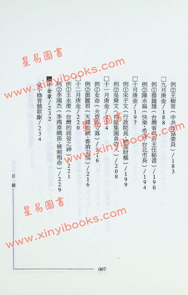 從本書引用的二百四十個命例,讀者可以發現這些個案的內容,除了國內外(政治)之外,還包括財經、醫學、藝術、文學、影劇、演藝、宗教、玄學、體育、歷史、社會事件等層面的關心,來印證我在「命理腦筋急轉彎」自序中所說的話:「作為一個現代命學家,觸角是要全方位的,才足以應付21世紀的新世紀。」目錄(續4)我不是(光說不練)的人,而是正說得到做得到的人--其實讀者在我已出版的三十六著作(一九八八年十二月至一九九六年四月,武陵出版有限公司出版)中,早就可以看得出我的治學精神,以及為五術界所作的奉獻。命例的敘述,我採用傳記結合報導的手法,並蒐集相關圖譬附刊,隱了傳主生平的真實性之外,增加了趣味性和可看性,另方面亦彌補了一九九一年出版「古今名人命運鑑賞」一書以後,念念不忘卻一直未能實行撰寫(古今中外名人命運研究)的心願。