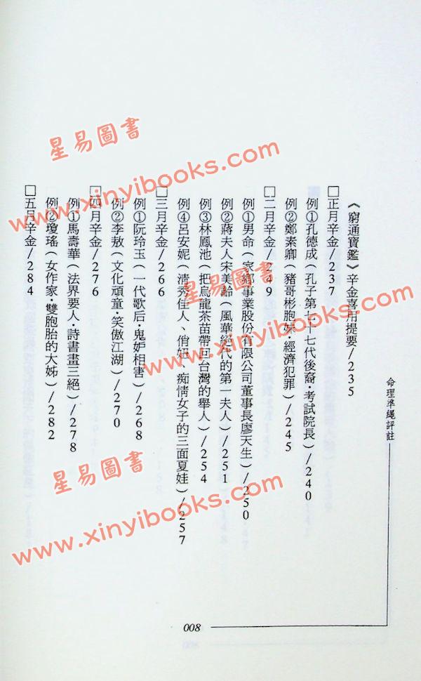 甲木章男15、女9 乙木章男15、女10 丙火章男14、女11 丁火章男16、女7 戊土章男19、女5 己土章男13、女4 庚金章男17、女9 辛金章男15、女11 壬水章男19、女5 癸水章男19、女7 全篇男167k8,共計240位。其中有的命例出自(造化元鑰評註),原批簡單,無生平事蹟,我加以補註敘述。每章之首,補充(金不換骨髓歌斷)及(窮通寶鑑)十干在各月份的喜用提要,便於讀者查用。