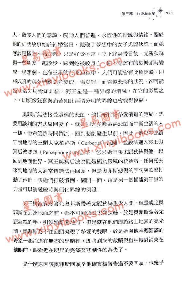 介紹作者對占星學的基本立場與態度,隨後帶入本書主題,亦即看待三王星(天王、海王、冥王)帶給個人的課題時,特別需要強調的省思重點。有助於讀者在學習時,有正確和正面的態度,不會對三王星有錯誤和恐懼的認知。
