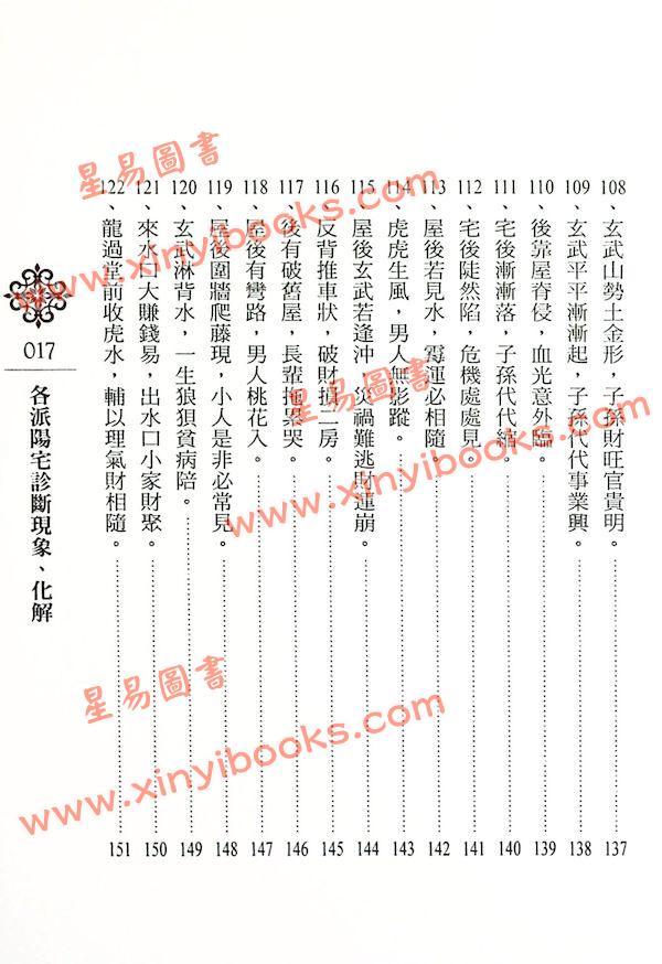 序/黃恆堉 三元經云:「人之福者,喻如美貌之人。宅之吉者,如醜陋之人得好衣裳,神采尤添一半。若命薄宅惡,即如醜人又衣弊,如何堪也。故人之居宅,大須慎擇。」即如醜陋之陽宅的重要對於前人生活一直是影響甚巨,並非現代人才重視。關於風水學的書籍及各派學理至今仍繼續被廣為探討,可見其重要。 陽宅的好壞有「陽宅外環境」及「宅內的規劃」兩者都是同等重要。每天從大門進出,客廳擺設、臥床的方位、辦公桌或書桌的位置,還有動線及光線,通通會影響到居住在家中,每一個人的運勢,所以不得不慎重。 陽宅地理而言:影響人之吉凶禍福因素有(一)外局破敗逢曜殺,(二)內局方位錯亂,所以在本書中,總共提到145條,要買屋或租屋之前,須考量到的外陽宅環境優劣及形煞問題。日後不管是自住或投資買賣都能安心,有了本書的分析對於陽宅的判斷一切就OK啦! 在本書第三章也談到,用八宅明鏡學派來直斷一間房子的好壞,以及會影響的人事物非常具有參考價值,重要的部份都有談到。 第四章則談到用九星水法來判定,一間房子到底有沒有收到財氣或人氣之磁場,這是攸關全家人和諧與否以及該房子能不能帶來財運的選擇因素。 第五章會談到,用紫白飛星法來診斷各宅向,房子之方位吉凶狀況,以及家中成員之流年運勢,以便做好開運制煞之規劃。 第六章則談到老祖宗傳承的陽宅直斷口訣,26條讓您一下子就成為大師。 總之,本書是用最容易了解,最容易記憶的圖解口訣,讓您花最少的時間學會最精準的陽宅診斷,幫助您在學習陽宅這門課程時,不會覺得那麼深奧,能引起閱讀動機和探索樂趣。進而藉由本書所詮釋的部分,應用於規劃住宅時定能有所幫助。期盼與讀者諸君共勉之! 最後感謝您,感恩您! 台中市五術教育協會 創會理事長 黃恆堉 癸巳年春季於 吉祥坊易經開運中心