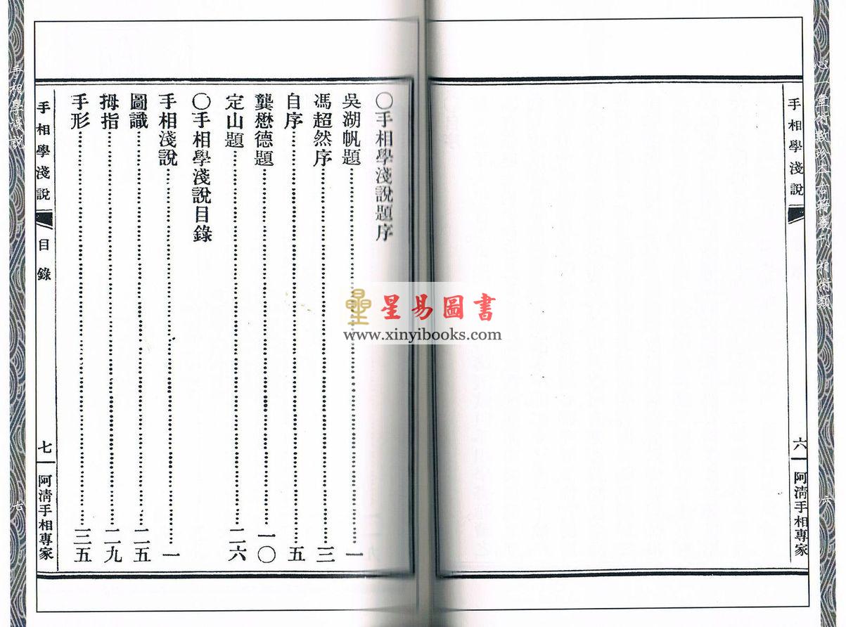 《手相學淺說》。一冊平裝。民國黃龍(阿清手相專家)撰。現據虛白廬藏民國三十四年(一九四五)黃龍自印本修復清理出版。