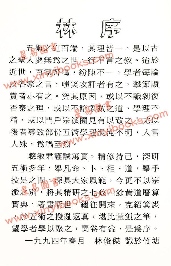 筆者不敏,自幼即趣五術,拜師多位習命卜擇日,深諳五術之精奧,執業之餘,猶感學尚不足,嗣又拜劉德義先生、黃學勂先生,研究七政天文曆學,今將多年所學、研究心得,寫成此書公諸於世,忱祈先進後學之士,得其門而入,而有所適從,進能青初於籃爾勝於藍久績,為余之所盼!
