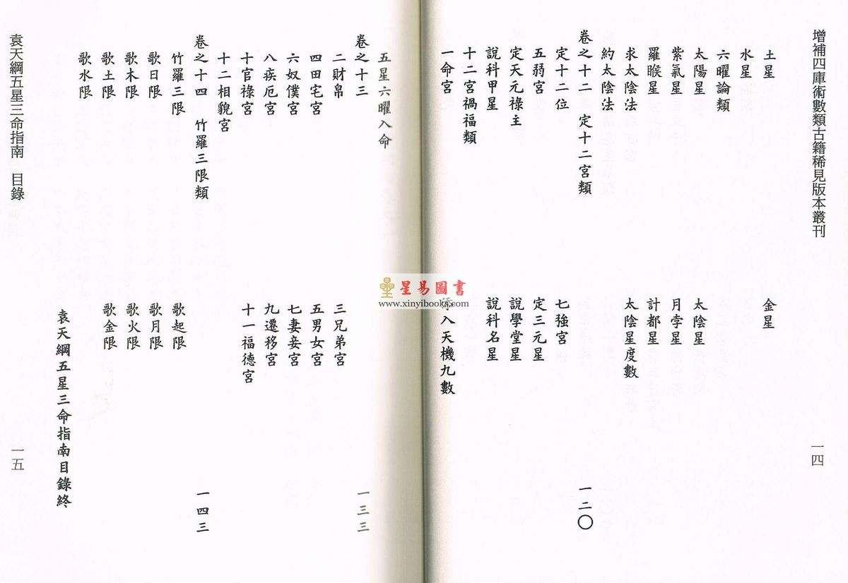 《袁天綱五星三命指南》十四卷,題唐袁天綱撰。袁天綱,又作袁天罡,益州成都人,生卒年不詳。考《唐書》記載為袁天綱,當以正史所載為是。隋末唐初天文學家、星象學家、預測家、風水大師、道士、相士。隋時為鹽官令,入唐為火井令,善風鑒,累驗不爽。相傳他懂得風鑒,即憑風聲風向可斷吉兇,又精通面相、六壬及五行等。據《新唐書·藝文三》載,其著述有《相書》七卷、《要訣》三卷。據宋鄭樵《通志·藝文略》載,除《相書》《要訣》二種,袁氏另有《人倫高抬貴手賦》一卷、《氣神經》五卷,《骨法》五卷三種。另有《易鏡玄要》一卷,久佚。《四庫全書總目·存目》有《九天玄女六壬課》一卷,為宋元時術士託名袁天罡撰。諸家書目未見《袁天綱五星三命指南》,當為託名之作。