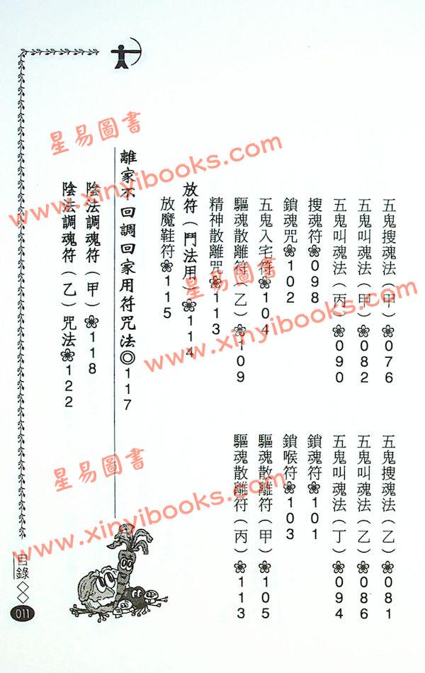 前半部「陰山法笈」的內容涵蓋「迷合、沖開、 叫魂、鎖魂、驅魂、調魂、招財」等六種法術, 這和一般的道壇法術相同,不同的是:利用陰兵陰將 及五鬼來驅符辦事,是以陰神為主流的派系,所以力道 直接而快速,當然,其副作用也很大。