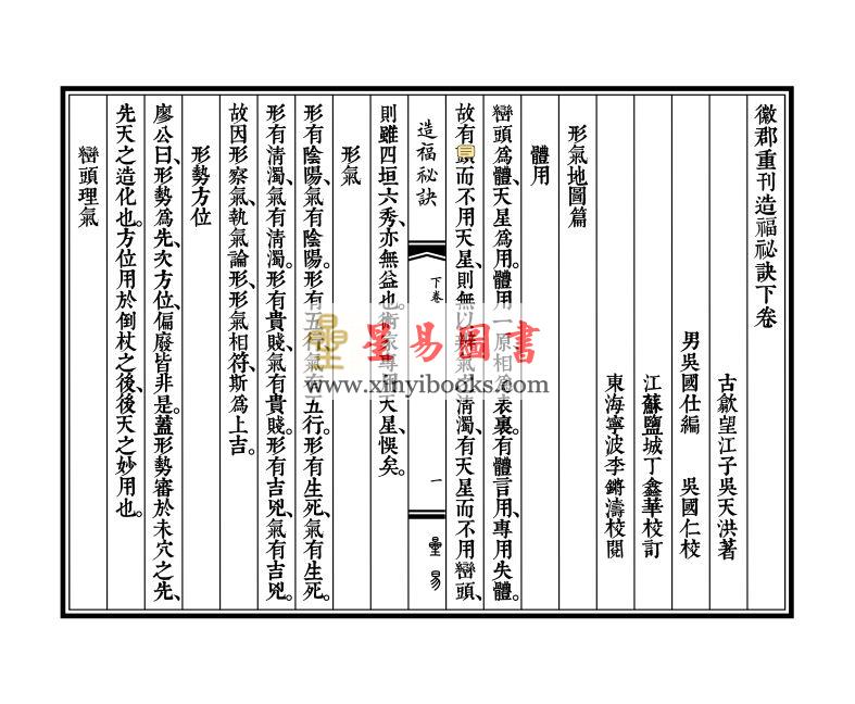 上卷天星理氣篇、由太極、陰陽、五行入手、兼及羅經、陽宅八門、詳述理氣奧秘。中卷形勢巒頭篇、由龍穴砂水、四獸入手、闡發形勢巒頭之妙。下卷形氣地圖篇、論及葬法、穴格、穴法等、同時集吳天洪堪輿詩文合計一百八十八首、篇幅占全書三分之一強、是全書精華所在。詩文人物涉及相國、狀元、御史、提學、知州、太守、秀才、儒生等各個階層、內容涉及師生問答、點穴、卜地等諸多秘訣秘法、琅琅上口、堪稱不易之作。