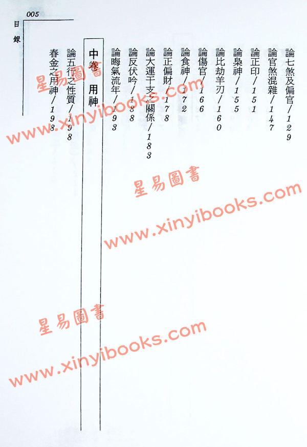 論命理之起源/論用神之大略/論生剋/論格局/論十干化氣/十干總論/論長生與墓絕/一長生/二墓庫/三絕處/論反伏吟/論干支之關係/論子午與巳亥/論合婚之輕重法/論六親之不清/論正官/論七煞及偏官/論用煞之大略/論官煞混雜/論正印/論梟印/論比劫羊刃/論傷官/論食神/論正偏財/論四時之節氣/論五星之性質/一金星/ 論春金之用神/論夏金之用神/論秋金之用神/論冬金之用神