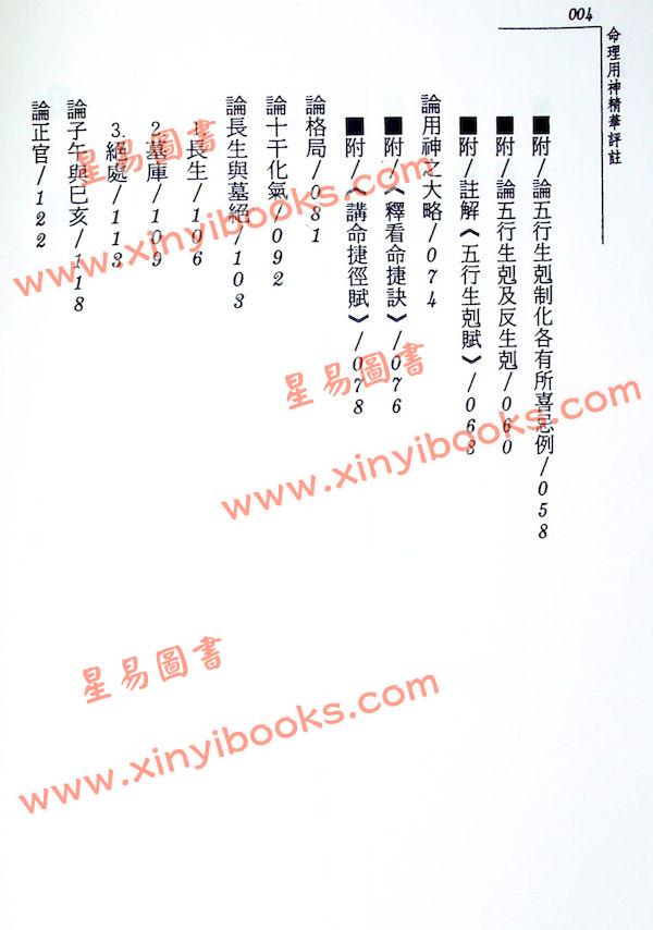 所以本書專重用神,其他生剋、論用神大略、四時節氣、八格、論長生變通法之類,俱要用神有連帶關係者,亦述之。 尚有用神之外,墓絕、滾浪、晦氣等類,其有應驗也,皆列載於後,願後學君子及售斯術者,有所明瞭。若以故意駭人,天理不容。 其餘一切大敗、八敗、鐵掃、華蓋、驛馬及星辰之類,與用神無關,刪除不載。 至於壽元識者希,知時須是洩天機,而且各種關係極多,如堪輿、配合心田等等,皆有利害,本書不錄。