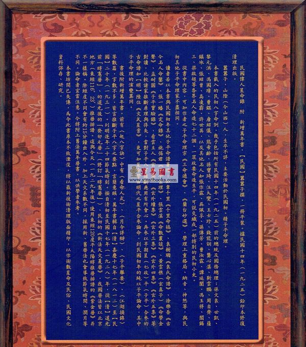 本書坊間已失傳,爲令此書原本不致湮沒,特以最新技術清理版面精印,以作術數星命及民俗、民國文化資料保存、研究。
