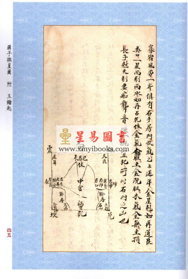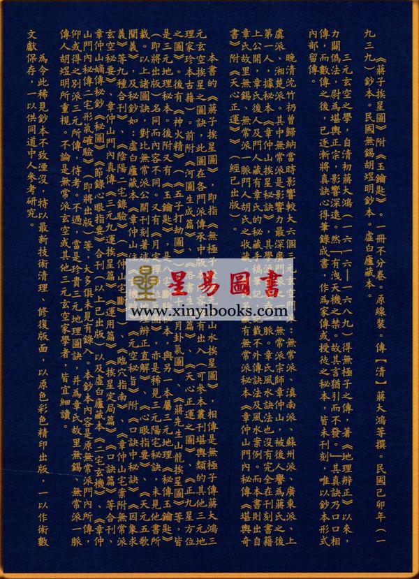本書的《蔣子挨星圖》,即指《無極子授蔣先生山水挨星圖》,相傳是無極子傳蔣大鴻三元玄空挨星之圖訣,此圖在各門派傳承中版本內容略有出入(可參本叢刊堪輿類的其他三元地理家珍本古藉)。前附《河圖生成篇》、《洛書生成篇》、《天心正運之圖》、《正九星方位之圖》。後有《神火精》(《五子打劫圖》)、《十二月卦氣圖》、《蔣先生山龍挨星圖》等,皆是三元地理秘本。後附又有《玉鑰匙》,是八宅斷驗秘本,與另一本屬三元地理《秘傳玉鑰匙》(即將出版)名同而內容不同。又有《月定禪師拉氣圖》,亦是稀見三元陽宅秘訣,未見他書所載。以上諸圖訣,對比無常派公開刊刻著述如:《地理辨正直解》、《心眼指要》、《天元五歌闡義》,及秘鈔如:虛白廬藏本《章仲山注《玄機賦》《元空秘旨》附《口訣中秘訣》《因象求義》等九種合刊》、《陰陽二宅錄驗》(《仲山宅斷》)、《臨穴指南》、《章仲山宅案附無常派玄空秘要》、章仲山門內真傳《三元九運挨星篇》《運用篇》《挨星定局篇》《口訣篇》等合刊、章仲山嫡傳秘鈔《秘圖》《節錄心眼指要》合刊(以上已出版)以及虛白廬藏本《二宅玄機》、《章仲山門內秘傳二宅形氣確驗》(即將出版)等,大多俱未見有錄入。本鈔本內容是原無常派門內所傳,仰或得之別派三元所傳,待考。不過,當是珍貴三元地理圖訣,并為章氏故里無錫、無常派一脈傳人胡煜明所重視。不論是無常派玄空或其他三元玄空家學者,皆宜細讀。