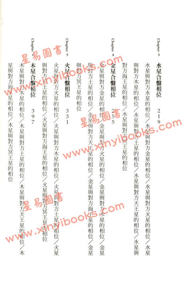本書為大家介紹雙人合盤中太陽、月亮、水星、金星、火星、木星、土星、天王星、海王星、冥王星的各種相位。包含太陽相位的日常人際關係,月亮相位的親密感、安全感,水星相位的學習與商業合作,金星、火星相位的情感、性欲與活動力,木星相位的社會資源,天王星、海王星相位的靈感,土星、冥王星相位的業力牽引。