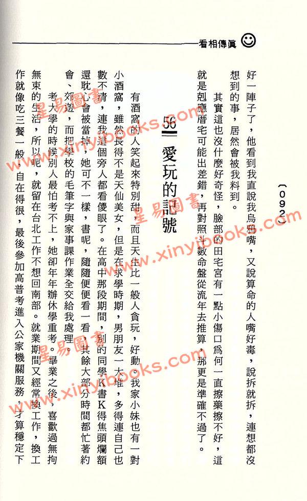 人心雖難測,但一個人的忠貞邪惡或富貴貧賤,皆顯現在其外表,善觀相者不難看出,即看相要得其重點。 作者以真人實事的故事解說,情節生活化而精采,借以傳述導引相學之要。 在下篇中,以多方面的解說,讓讀者能有更整體性的認知。例如;痣、斑、形質、上中下停、命宮、天倉、眼鼻口、顴、地庫、妻妾宮……等。 王序 陳序 自序 上篇 看相現場 床頭吵床尾和 孤獨高矗反為凶 人中有破求子難 鼻子短小,權勢不保 幸福的童年 遷移宮的神奇變化 奪夫之相 陽宅的影響力不可忽視 婆媳的老問題 為父母犧牲的事業線 一切隨緣 醉漢夢財 快跑,有人要殺我 相隨心轉 女人真命苦 BMW的心聲 五官太硬夫緣薄 準頭上的血絲 顴有破陷,事與願違 千億新娘 被覆蓋的事業宮 掌上有牢獄紋 叫人受不了的懸針紋 法令入口主餓死 印堂發光 好個烏鴉嘴的老婆 路邊小販 磁場感應 年上、壽上有痣,離婚不只一次 是永浴愛河?還是桃花煩惱多? 山根對婚姻的影響 耳朵會說話 蘭台、廷尉與財運 鼻子有痣麻煩多 探索人中的奧秘 手常溫者不求於人 耳朵痣痣可測晚年財運 唇部有痣桃花開 法令兩側有痣,容易罹患膽結石 范丹一妻配九夫,閉目癖的女性夫運不佳 命宮疤痕最傷人 紅牌舞女的命運 手指彎曲,人生坎坷 夫妻宮浮青筋,感情出問題 外甥提燈籠(照舊) 須負養家責任的女人 癡人說夢話 女人男音,不得夫緣 事出有因,必有兆 眉中藏貴氣 自卑真叫人無奈 把愛情賭掉 眼下有雀斑的男性 蓋髮遮額的女性 破陷的田宅宮 愛玩的記號 眼睛大子目 母親在何方 小鼻子不可能有大事業 毛髮看運途 鼻翼的肉瘤 鬥雞眼的悲哀 法令紋的死痣 惡痣不除害一生 兄弟宮破陷 蘭台有破,麻煩難躲 山根及玉嶺的傷痕 紅鼻子 下篇 命相斷驗談 十二宮圖 痣、斑 形質 心性質、營養質、筋骨質 上停 命宮 天倉 中停 眼 鼻 顴 耳朵 下停 人中 口 地庫 管理宮 妻妾宮 子女宮 陳 序 人際關係在現代社會是佔了很重要的一門學問,擇交朋友,為人生事業成敗的關鍵,益友給了我們精神生活的勉勵,損友則使人生陷入了不可自拔的深淵。 要知人識相,最好的方法,就是研究面相學,由面相了解你四週的老友、部屬,是擇交用人最好的方法,祇要你抓到面相的重點,就可了解一個人的忠貞邪惡或富貴貧賤。 有位長者,以他多年跑江湖的經驗再三諄誡於我說;「社會上有十種人切記不可交往,如交往也要小心為要!」我問道:「那十種人?」他說: 一. 斑 斑斑者,之人也。麻臉之人窮表現! 二. 矮 矮人多恨,不可得罪他,否則終身招怨! 三. 毬毛 毬者,髮捲者也。毬毛之人, 作事斤斤計較! 四. 凸目 凸目者,眼睛凸露之人也。俗語說: 凸目牛好駛,凸目人無情! 五. 鬍 鬍者,鬍多之人也。鬍者,作事鬍也, 也就是金錢上和人牽扯不清也! 六. 勾鼻 其人之鼻如鸚鵡之嘴,勾入不勾出, 吝嗇也! 七. 歪 歪者,駝背之人也,又稱精,作事情 愛討價還價! 八. 跩 跩者,走路搖擺也。俗語說:搖豬無例, 搖人無才!佷神氣的樣子。 九. 跛腳 跛腳之人,內心不平衡,愛恨心強! 十. 無鼻 無鼻之人,自卑感重,愛陷害人! 又說:「柳葉眉,軩魚嘴,愈看愈將才。馬面深溝,犁壁臉多草,桃花面打死無走(指女人而言)」 形容強人就說:「龍行虎步、熊腰、虎背、豹頭、燕頸!」比喻小人則說:「蛇行雀步、猴頭、老虎耳、鳥仔腸、雞仔肚、雞胸、鴨背!」 好友宋春迎,專研手面相、斗數多年,做人豪爽,人生閱歷頗豐,為五術界明日之星,今有意將他在為人觀相之心得,筆之於書交給武陵出版有限公司出版,問序於我,閱之,頗有獨特之見解,令人愛不釋手也,為研求相學者不可多得之好書,研究必有所得,是樂為之序。 王序 面相一見,可知吉凶禍福,事業順否,看額頭天庭部,夫妻感情佳否,看眼睛魚尾奸門部,子女緣份看激堂,運途吉凶看命宮(即印堂,在雙眉間),錢財看鼻頭,世人所關心的妻財子祿,從面相五官和氣色配觀,即知禍福。 未小姐研究命相多年,本性灑脫、見識廣博,曾從事代書、巿場管理工作,交遊廣闊,上至達官顯要,下至販夫走卒,對人性的瞭解、世事順暢波折,觀察入微。今將開命相館多年的經驗,和在機關團體教學演講精要彙集成冊,訂名<看相傳真>,希望能給對面相學有興趣的人參考、研究,實乃學者一大福音。 最後祝本書能洛陽紙貴大熱賣,閱本書者收穫無窮,見相識人。 高雄靈氣地理命相雜誌推展會理事長 王明陽謹識 自 序 筆者世居高雄市小港區,原先的小港區並不像目前這麼熱鬧,而是純樸的鄉下村莊,幾乎有八成是世代務農,包括筆者家族在內。農村要求的是勞力,對讀書識字自然就不是那麼很講究,以村子裡有好多比較年長的人如遇到要搬家擇日、修灶、或嬰兒命名、探病等等 ... 都翻翻農會贈送的黃曆來做參考。筆者自幼就有一種服務大眾的使命感,在上初中二年級就開始做家中財物收支紀錄的工作,當個沒有薪水的小會計,附近人家都認為我精明能幹,所以後來翻黃曆做參考的任務大多數都由我代勞。 雖然年紀小又是外行人,但是最起碼我識字,那時候我往往會選那一天那一行字最多,那一天準是好日子,現在想起來覺得很好玩。在這種被鄰居器重的情況之下,我除了學校的功課外,在命理、玄學方面也儘量做充實,甚至還會求教鄰村頗有名望的長者,出社會之後還拜師全心潛學此道,這也正是個人對這方面的興趣所致。 目前我在住宅開設明妙堂擇日命相館,專以