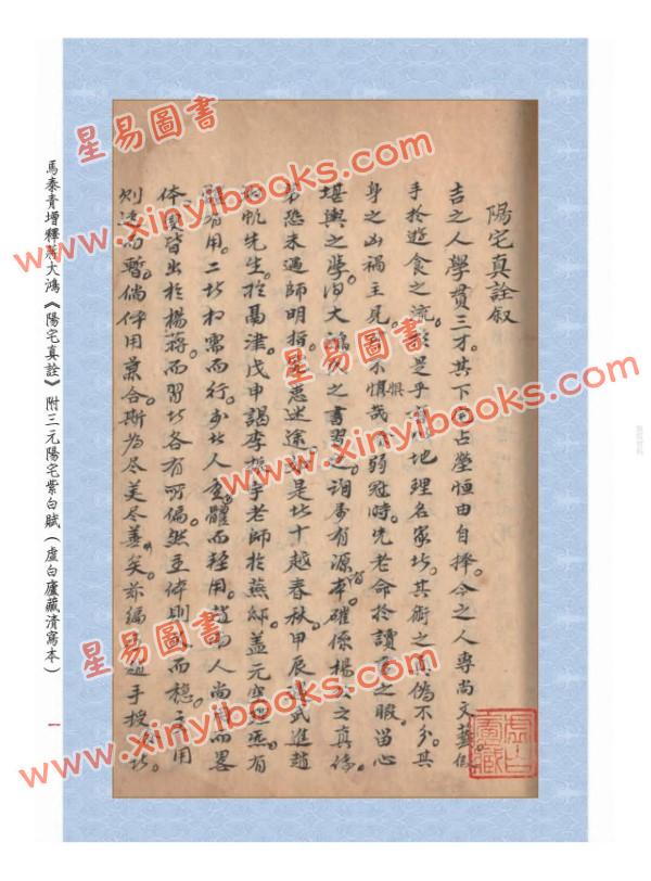 馬泰青增釋蔣大鴻《陽宅真詮》附《三元陽宅紫白賦》。一冊上下卷。【清】蔣大鴻授、【清】楊道聲輯、【清】馬泰青、【清】黃東川註、【清】馬泰青增釋。原線裝。虛白廬藏民國浙江紹興三元地師胡靜思(煜明)鈔本。胡氏另藏有無常派章仲山門內秘傳《堪輿奇書》附《天心正運》、《蔣子挨星圖》附《玉鑰匙》(已出版) 。