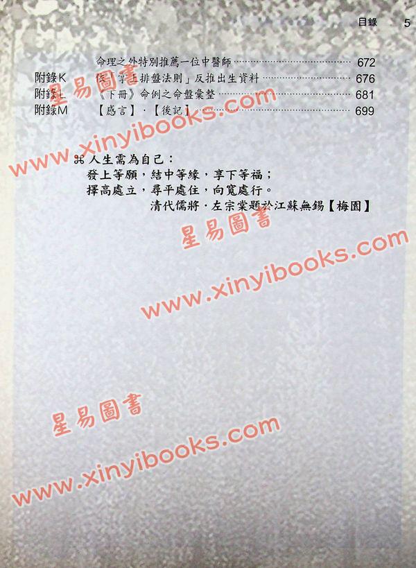 附錄中,兼及五術研習者,所需涵養的《姓名學、陽宅學、測字學、斗數占卜學、全球時差校正》,及斗數發展史的各派別沿革故事。