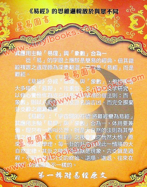 《易經》;「宇宙間的符號:將難經變為易經」其應用主軸「易理」與「象數」合為一,體用要兼備,理只有一個叫公理,就是大自然的法則為其學理之依據;深入《易經》之後會讓您恍然大悟,原來卦名就是學理,每一卦的卦名表現此一情境的大自然定律,其卦之陰陽符號就是現象,六爻就是過程,不同卦象其六爻的終始、逆順、進退、往來在360度的圓周是不一樣的。