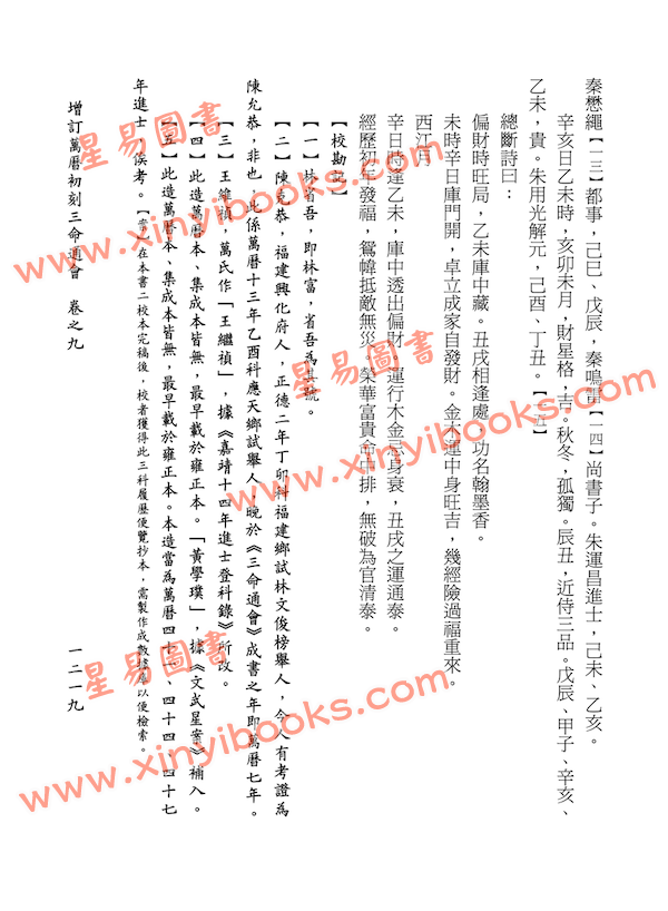 《儒門評註節解命理真機摘要》,四卷,明呂祖尚撰,明萬曆刻本,香港方紀然先生藏本。《星平總會命海全編》,十卷首一卷,明薛承愛撰,夏從仁編,萬曆三十九年潭邑文林積善堂陳奇泉刻本,美國哈佛大學東方圖書館藏本。